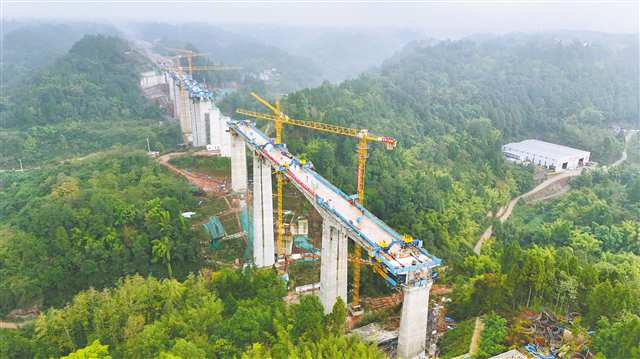 11月4日,随着最后一方混凝土浇筑完成,成渝中线高铁重庆段的全线控制性工程——一碗水双线特大桥连续梁顺利合龙,为全线通车奠定坚实基础。