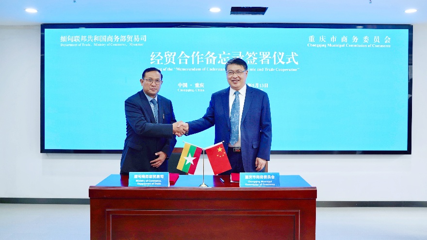 5月13日下午,在中缅建交75周年之际,重庆市商务委与缅甸商务部贸易司成功签署经贸合作备忘录,并举办中国(重庆)—缅甸经贸对接会。